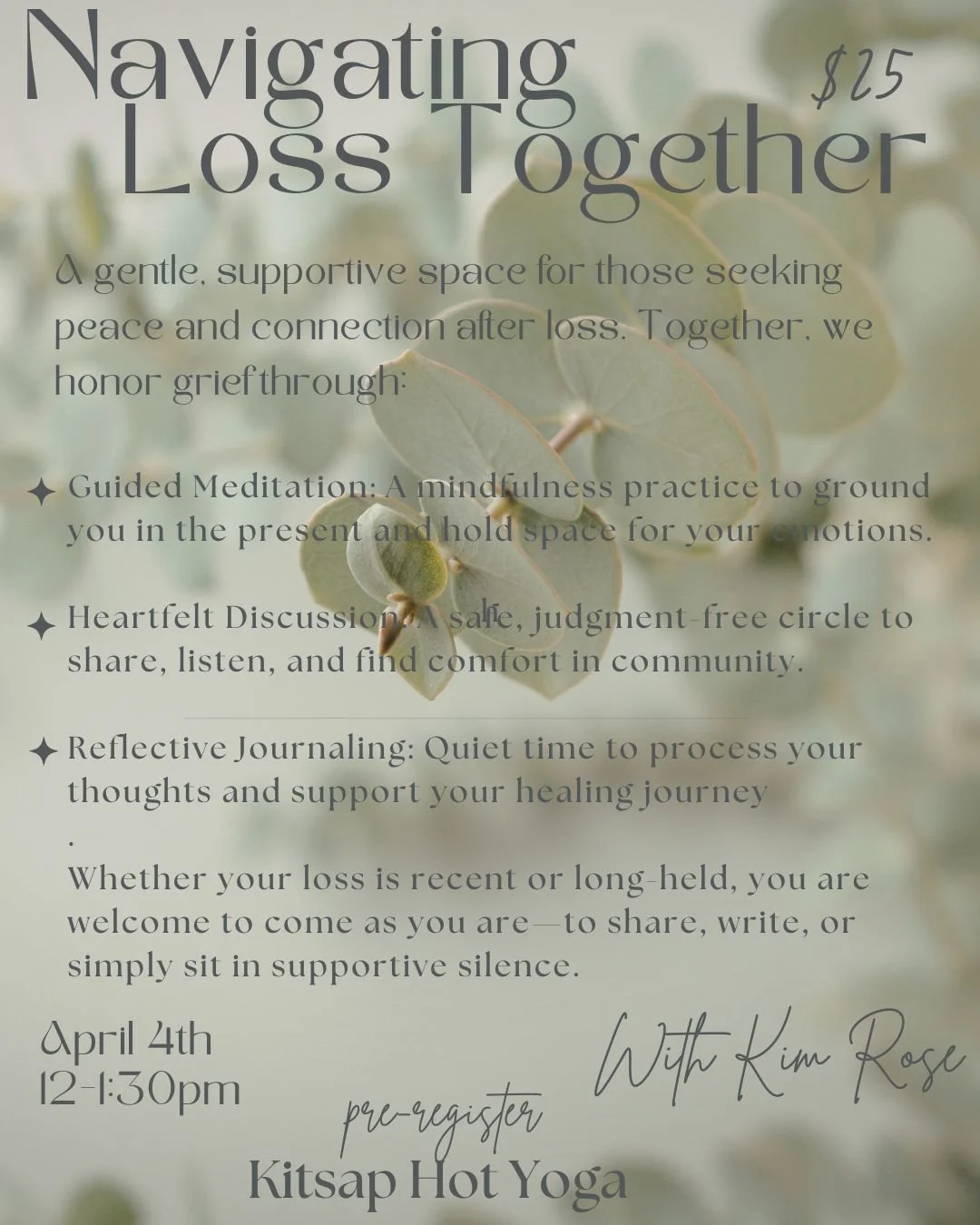 A gentle, supportive space designed for those seeking peace and connection after loss. In this session, we honor the complexity of loss through three practices: • Guided Meditation: We begin with a mindfulness-based meditation to help anchor you in the present, steady the mind, and create a compassionate environment for whatever emotions arise. • Heartfelt Discussion: Following the meditation, we open the circle for shared reflection. This is a safe, judgment-free space to speak your truth, listen to others, and find solace in our shared human experience. • Reflective Journaling: An opportunity to help you process your thoughts privately, giving voice to the unsaid and documenting your personal path toward healing. Whether your loss is recent or long-held, you are welcome to come as you are—to share, to write, or simply to sit in the quiet comfort of community.